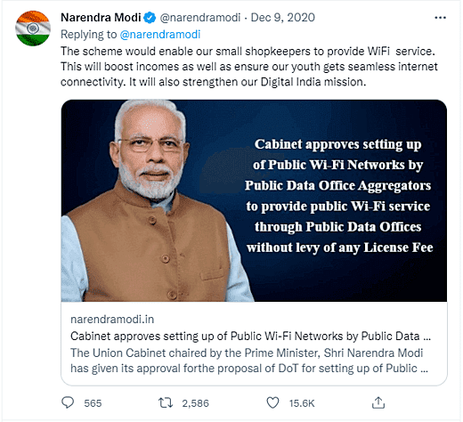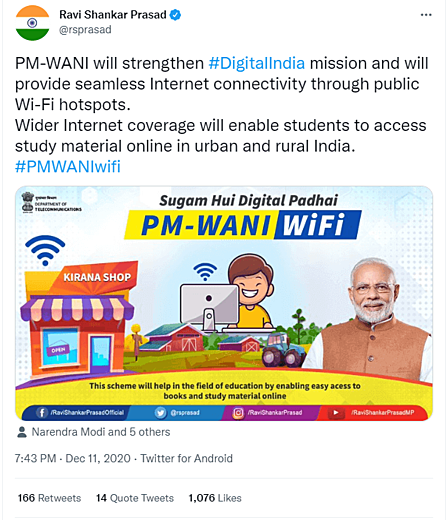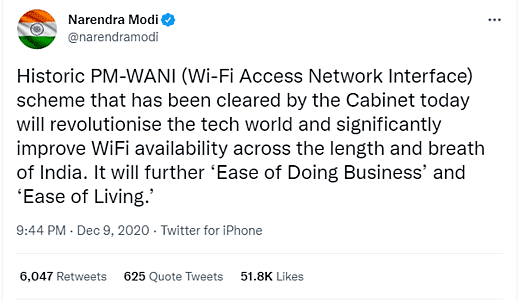 PM WANI or the Prime Minister’s Wi-Fi Access Network Interface is aiming to bring large-scale deployment of Wi-Fi access points throughout the nation to improve digital connectivity options. “Historic PM-WANI (Wi-Fi Access Network Interface) scheme that has been cleared by the Cabinet today will revolutionize the tech world and significantly improve Wi-Fi availability across the length and breadth of India. It will further ‘Ease of Doing Business and ‘Ease of Living.” Tweet by PM Narendra Modi.